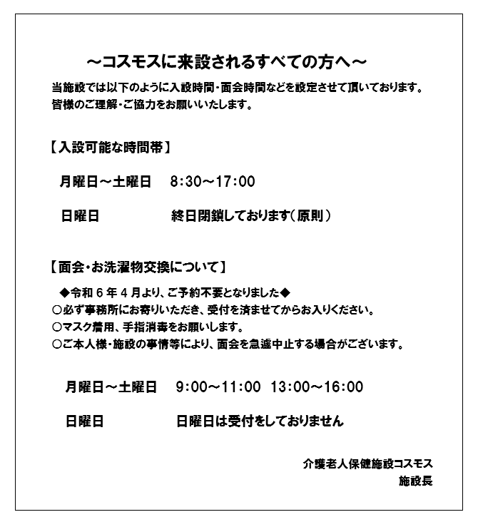 なごみ棟(一般棟)にて新型コロナウイルス感染症が発生していた為、面会を中止しておりましたが、感染した方々の健康観察期間が終了しましたので、通常通り面会していただけるようになりました。詳細は下記の~コスモスに来設されるすべての方へ~をご覧ください。